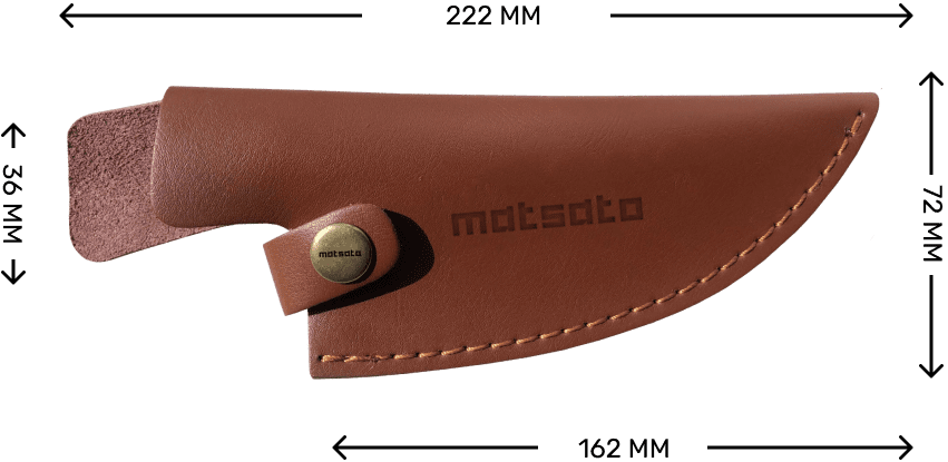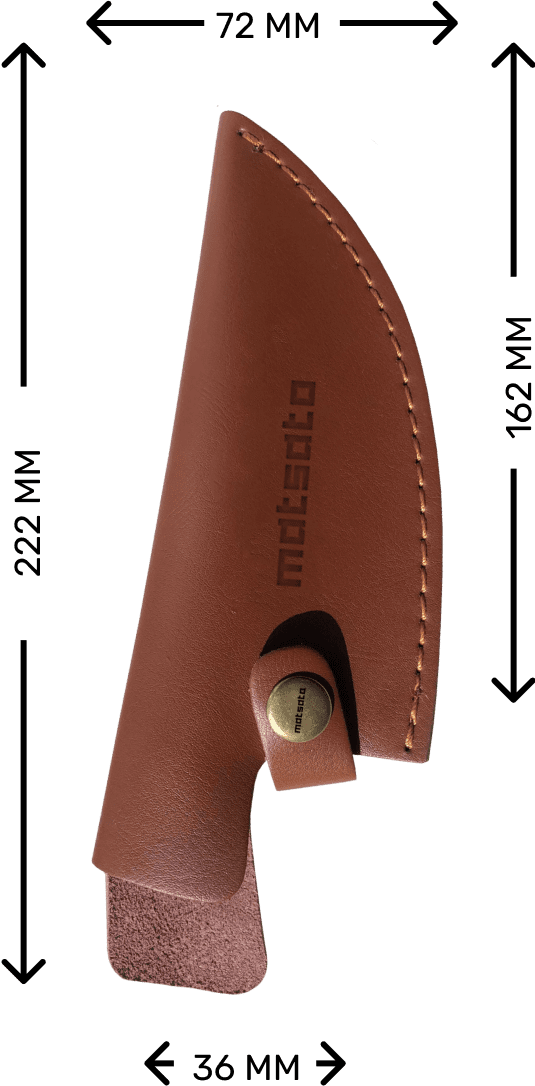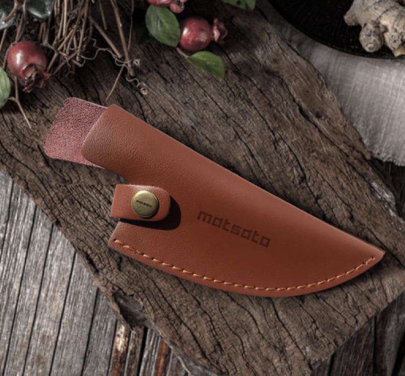 Teaca din piele Matsato a fost creată pentru a se mula perfect pe cuțitul Matsato, acoperindu-l de la vârf până la mâner, pentru a vă proteja lama. Aceasta oferă o căptușeală suplimentară pentru a-l proteja împotriva loviturilor accidentale și are o închidere sigură pentru a vă asigura că cuțitul Matsato rămâne în siguranță în interior.